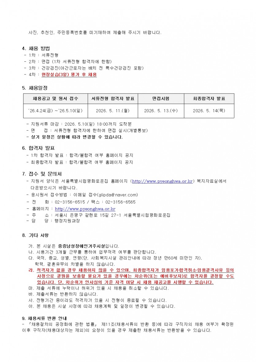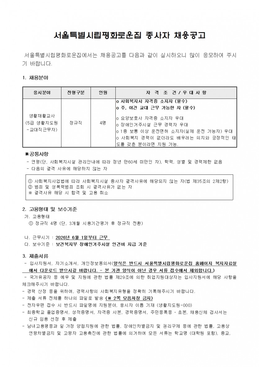 평화로운집 2차 직원(생활지도원) 채용 공고 페이지 정보 작성자 한동주 작성일 26-04-24 14:29 조회 21회 댓글 0건 첨부파일 파일 시립평화로운집 입사지원서이력서,자기소개서및개인정보동의서.hwp (54.0K) 0회 다운로드 DATE : 2026-04-24 14:29:20 본문 다음글 목록 답변