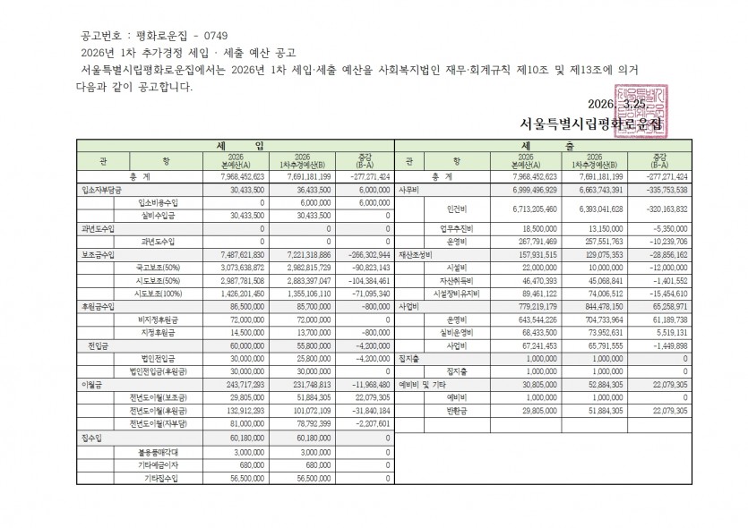 2026년 1차 추가경정 예산 공고 페이지 정보 작성자 한동주 작성일 26-03-25 16:51 조회 30회 댓글 0건 첨부파일 파일 홈페이지공고 .pdf (75.1K) 1회 다운로드 DATE : 2026-03-25 16:51:20 본문 이전글 다음글 목록 답변