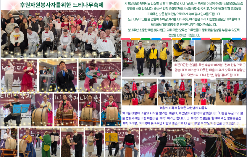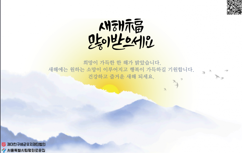 2026년 시립평화로운집 1월 후원감사편지 페이지 정보 작성자 장설궁 작성일 26-01-04 09:52 조회 701회 댓글 0건 본문 2026년 병오년이 밝았습니다. 지난 한 해 보내주신 배려에 깊이 감사드리며, 새해에도 건강과 평안이 늘 함께하시길 기원드립니다.병오년 새해를 맞아 가정에 행복이 가득하시고, 하시는 일마다 좋은 결실이 있기를 바랍니다. 이전글 다음글 목록