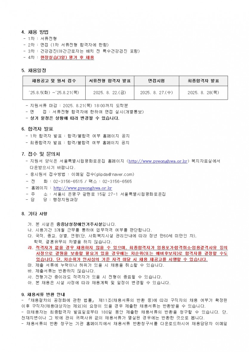 시립평화로운집 제6차 신입직원 채용공고(생활지도원) 페이지 정보 작성자 한동주 작성일 25-08-05 16:09 조회 7,679회 댓글 0건 첨부파일 파일 시립평화로운집 입사지원서이력서,자기소개서및개인정보동의서.hwp (54.0K) 106회 다운로드 DATE : 2025-08-05 16:10:16 파일 2025년 6차 생활지도원채용공고.pdf (68.3K) 100회 다운로드 DATE : 2025-08-05 16:10:16 본문 이전글 다음글 목록 답변