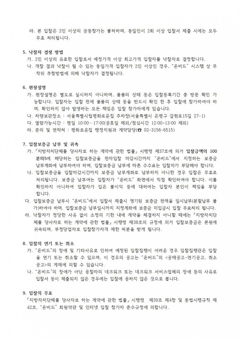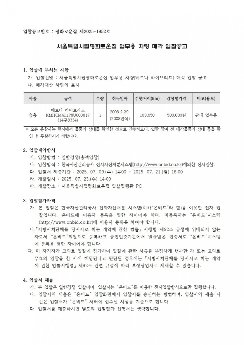 업무용 차량 매각 한국자산관리공사 전자자산처분시스템(온비드) 입찰공고 페이지 정보 작성자 한동주 작성일 25-07-09 11:45 조회 8,522회 댓글 0건 첨부파일 파일 입찰공고서_온비드_차량매각_공고문.hwp (70.5K) 91회 다운로드 DATE : 2025-07-09 11:45:50 본문 이전글 다음글 목록 답변