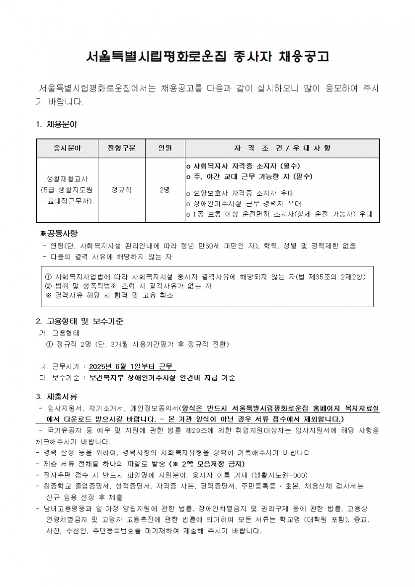 평화로운집 2025년 3차 종사자(생활지도원) 채용 공고 페이지 정보 작성자 한동주 작성일 25-05-02 14:08 조회 11,064회 댓글 0건 첨부파일 파일 2025년-생활지도원 3차.hwp (114.5K) 97회 다운로드 DATE : 2025-05-02 14:08:29 파일 시립평화로운집 입사지원서이력서,자기소개서및개인정보동의서.hwp (54.0K) 149회 다운로드 DATE : 2025-05-02 14:08:29 본문 평화로운집 2025년 3차 종사자(생활지도원) 채용을 다음과 같이 공고합니다. 이전글 다음글 목록 답변