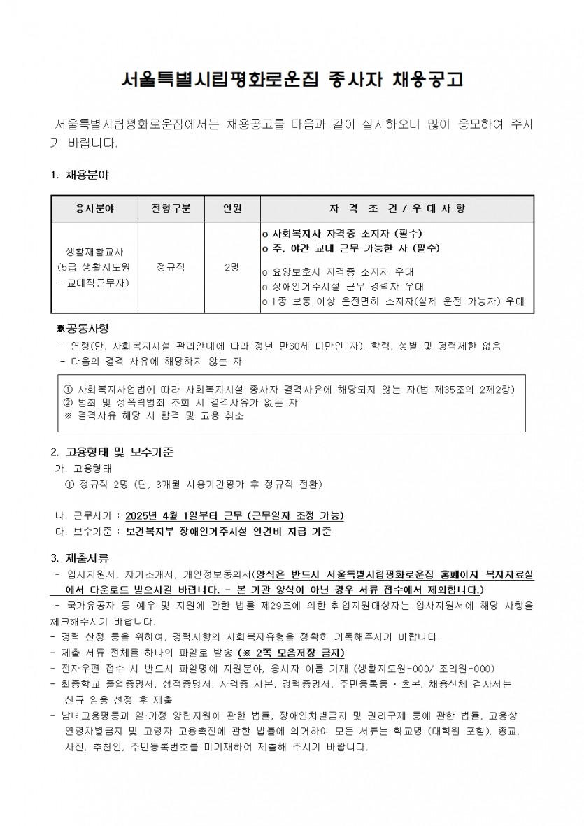 제2차 서울특별시립평화로운집 종사자 채용공고 페이지 정보 작성자 한동주 작성일 25-03-01 10:04 조회 13,479회 댓글 0건 첨부파일 파일 2025년-생활지도원 2차.hwp (58.5K) 154회 다운로드 DATE : 2025-03-01 10:07:51 파일 시립평화로운집 입사지원서이력서,자기소개서및개인정보동의서.hwp (54.0K) 188회 다운로드 DATE : 2025-03-01 10:07:51 본문 이전글 다음글 목록 답변