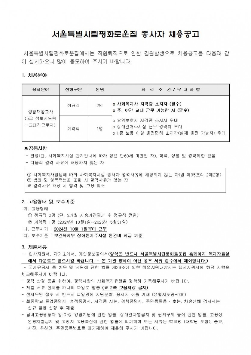2024년 제9차 종사자 채용 모집공고 페이지 정보 작성자 한동주 작성일 24-09-04 17:18 조회 17,874회 댓글 0건 첨부파일 파일 시립평화로운집 입사지원서이력서,자기소개서및개인정보동의서.hwp (22.5K) 132회 다운로드 DATE : 2024-09-04 17:18:55 파일 2024년-생활지도원 9월.hwp (36.5K) 109회 다운로드 DATE : 2024-09-04 17:18:55 본문 이전글 다음글 목록 답변