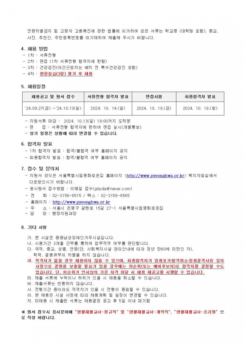 평화로운집 제10차 직원채용공고 페이지 정보 작성자 한동주 작성일 24-09-27 17:36 조회 17,506회 댓글 0건 첨부파일 파일 2024년-생활지도원 10월.hwp (36.5K) 108회 다운로드 DATE : 2024-09-27 17:36:34 파일 시립평화로운집 입사지원서이력서,자기소개서및개인정보동의서.hwp (22.5K) 80회 다운로드 DATE : 2024-09-27 17:36:34 본문 이전글 다음글 목록 답변