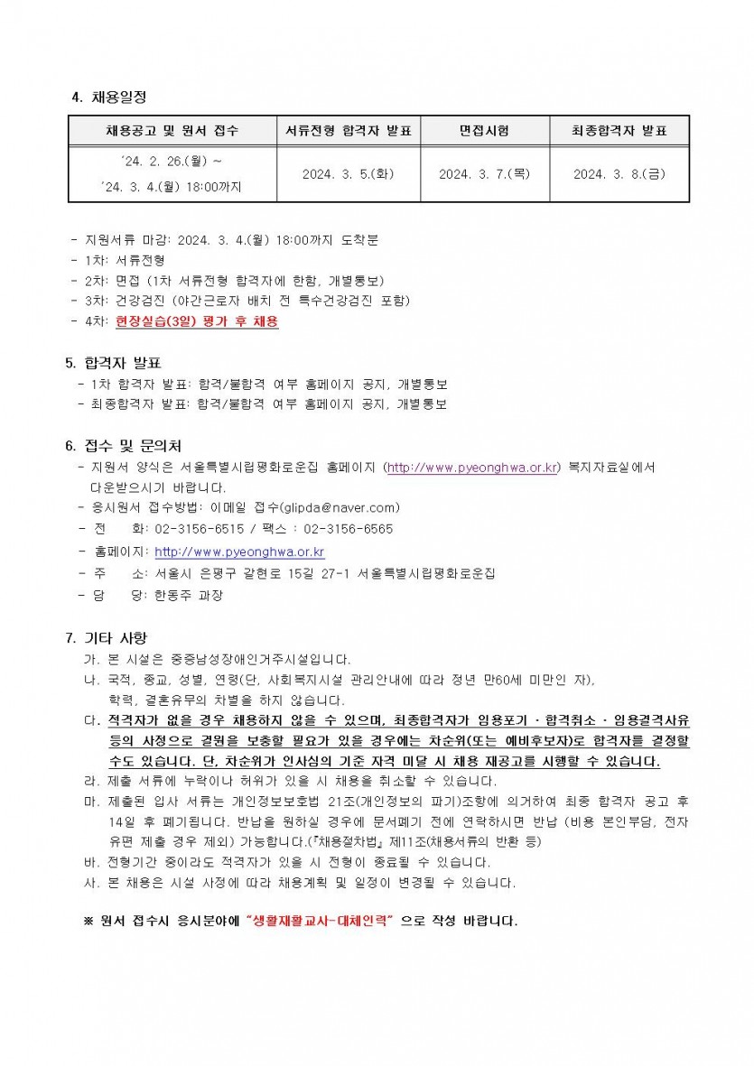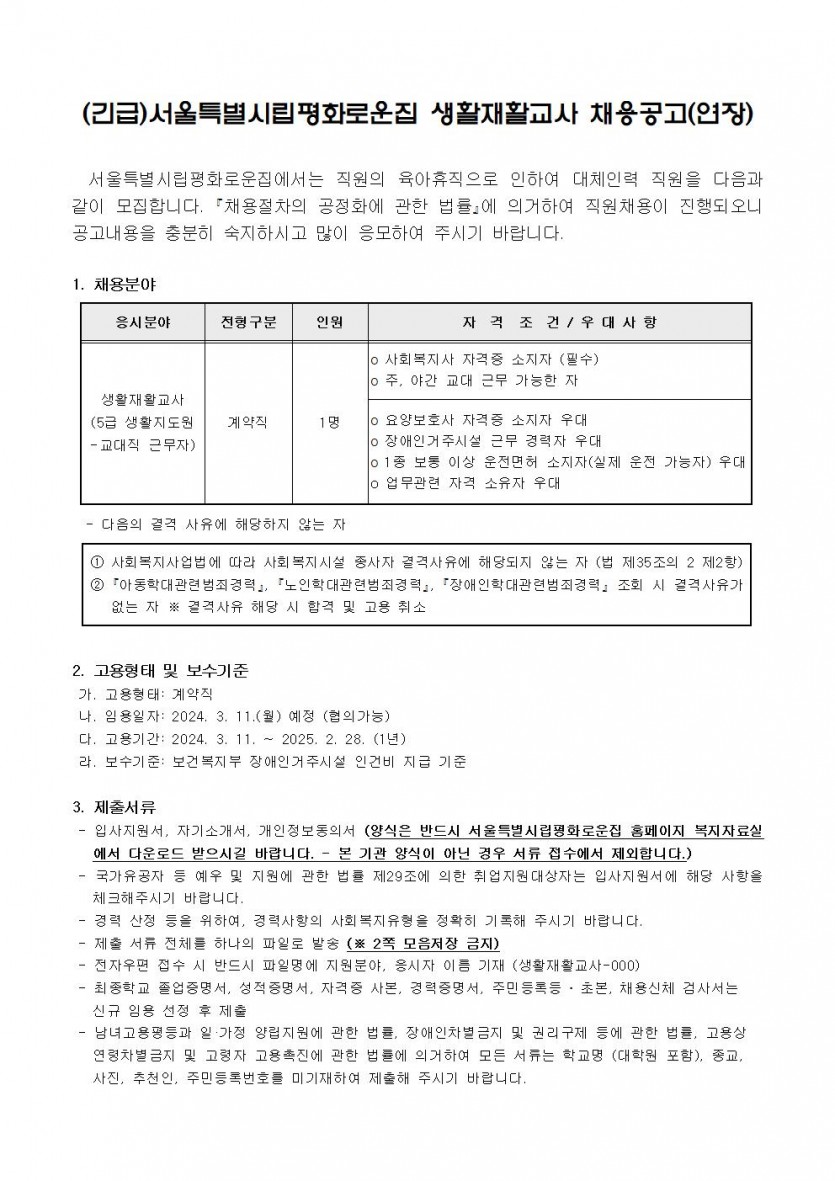 (긴급)서울특별시립평화로운집 생활재활교사 채용공고(연장) 페이지 정보 작성자 한동주 작성일 24-02-26 14:43 조회 20,159회 댓글 0건 첨부파일 파일 시립평화로운집 입사지원서이력서,자기소개서및개인정보동의서.hwp (22.5K) 143회 다운로드 DATE : 2024-02-26 14:43:58 본문 이전글 다음글 목록 답변