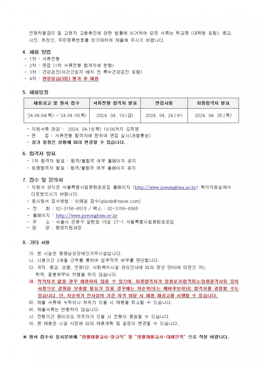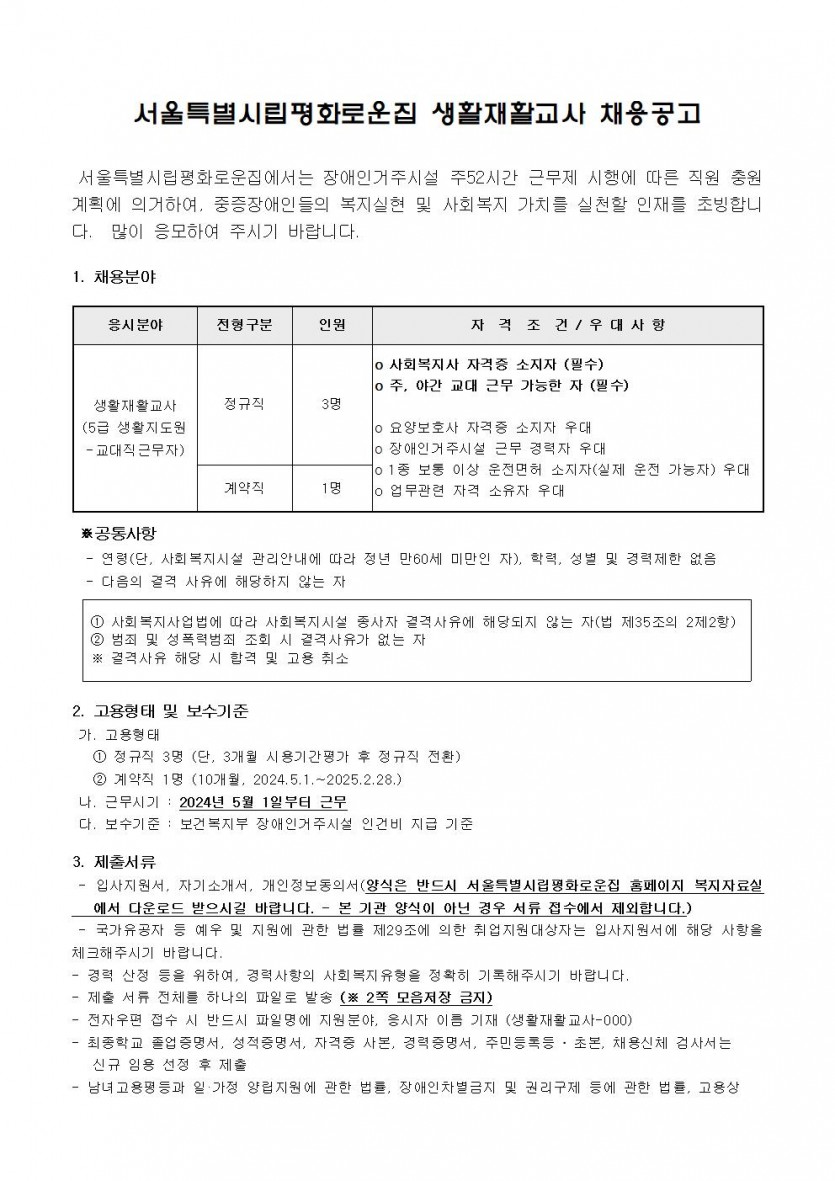 2024년 4차 직원채용(생활지도원) 모집공고 페이지 정보 작성자 한동주 작성일 24-04-04 17:29 조회 19,113회 댓글 0건 첨부파일 파일 시립평화로운집 입사지원서이력서,자기소개서및개인정보동의서.hwp (22.5K) 175회 다운로드 DATE : 2024-04-04 17:29:21 본문 장애인거주시설 주52시간 근무제 시행에 따라 정규직으로 근무할 생활재활교사(생활지도원) 채용 모집 공고를 실시하고자 합니다. 이전글 다음글 목록 답변