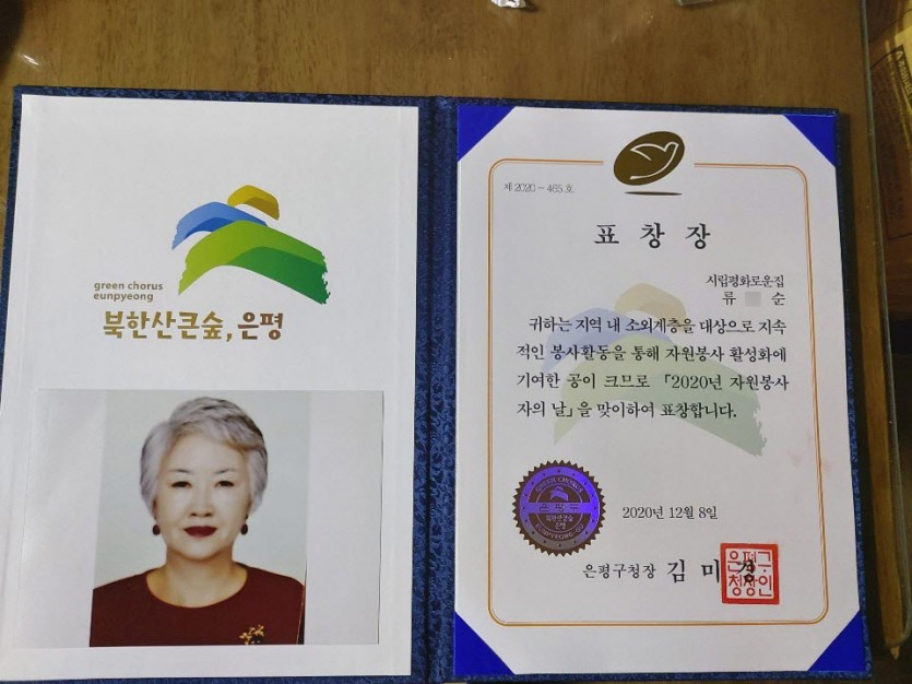 후원자·봉사자 이야기 | 우수자원봉사자 류0순 봉사자님 은평구청장 표창장 축하드립니다! 페이지 정보 작성자 박성호 작성일 20-12-14 18:11 조회 13,183회 댓글 0건 본문 - 은평구청장 표창장 우수자원 봉사자 류O순2011년 부터 시립평화로운집을 위해 아낌없이 봉사활동을 해주신 류O순 봉사자님 께서 2020년 은평구 우수자원봉사자 표창을 수여 받았습니다!! 진심으로 축하 드립니다^^ 앞으로도 평화로운집을 위해 많은 활동 부탁드리겠습니다. 감사합니다. 이전글 다음글 목록