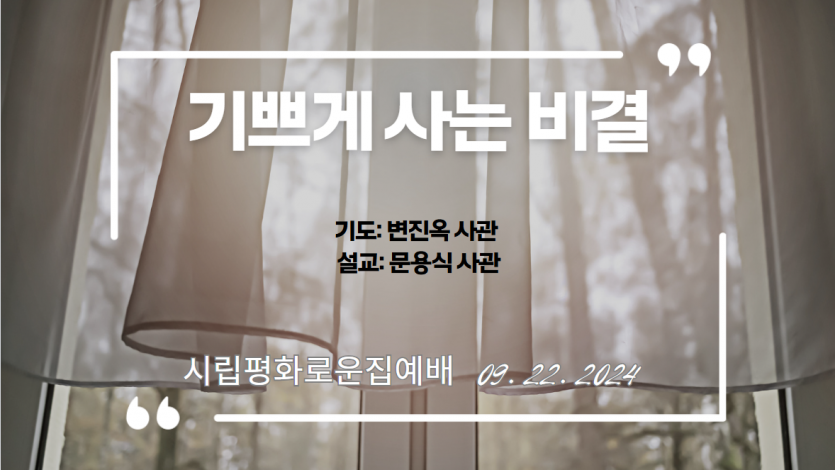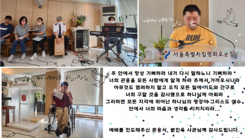 거주인 이야기 | 09.22. 주일 성결 예배 페이지 정보 작성자 장설궁 작성일 24-09-22 15:16 조회 7,224회 댓글 0건 본문 "주 안에서 항상 기뻐하라 내가 다시 말하노니 기뻐하라"기쁘게 사는 비결 정직함을 잃어버리지 마시고, 지난 과오는 잊어버리시고 하나님은 우리의 지난 과오는 기억하지 않으시니..문용식 사관님께서 전해주신 말씀처럼 스스로 자기 삶에 만족하고항상 기뻐하시기를 바라겠습니다~예배를 인도해주신 문용식, 변진옥 사관님 감사합니다. 이전글 다음글 목록