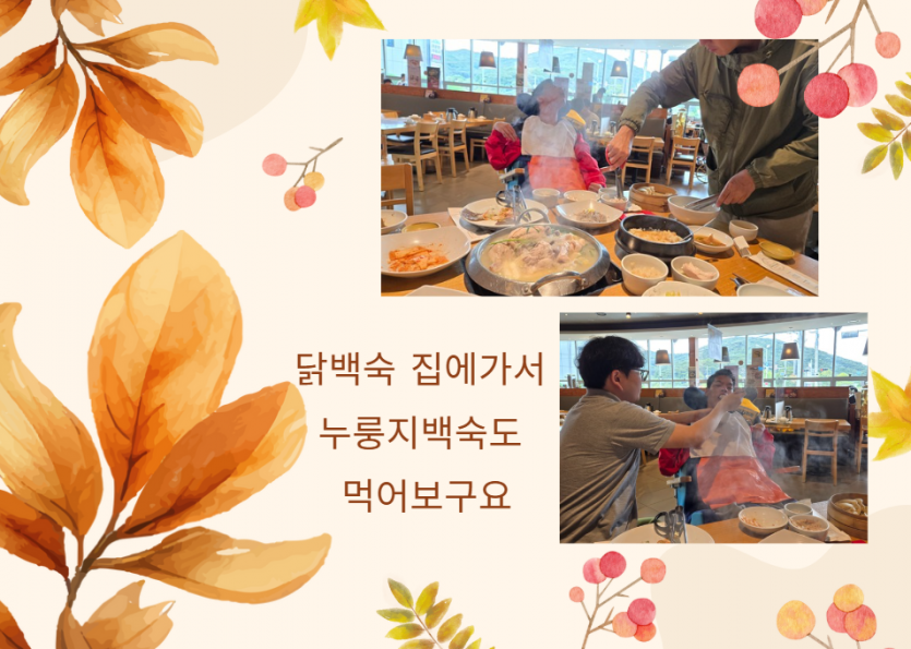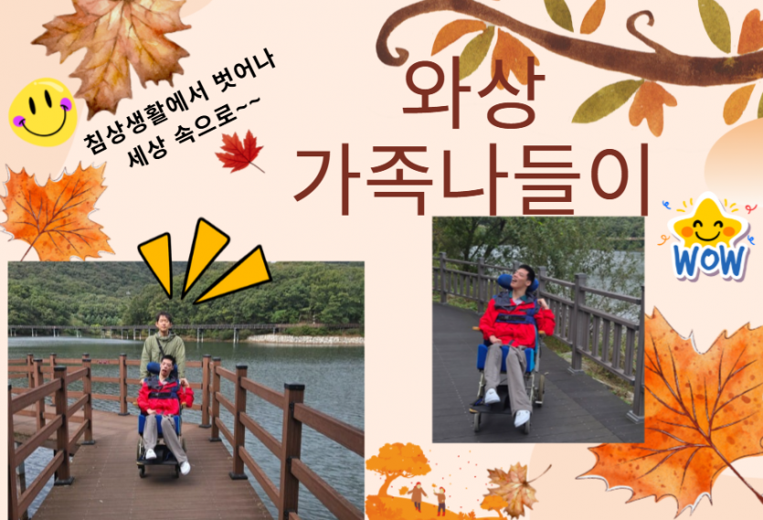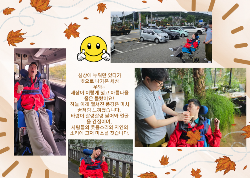 거주인 이야기 | 2025 와상 가족 나들이 페이지 정보 작성자 장설궁 작성일 25-10-30 09:41 조회 2,084회 댓글 0건 본문 와상가족나들이 침상에서만 지내다 첫 외출을 합니다.선생님들과 함께 바깥으로 나서는 순간, 상쾌한 바람이 얼굴을 스치니 웃음이 절로 납니다.오랜만에 보는 주변의 풍경은 새롭게만 느껴집니다.오늘의 나들이는 오래도록 기억될 소중한 시간이 되었습니다. 감사합니다. 이전글 다음글 검색 목록