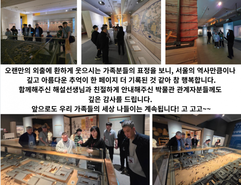 거주인 이야기 | 서울역사박물관 견학 페이지 정보 작성자 장설궁 작성일 26-04-03 17:37 조회 48회 댓글 0건 본문 살랑살랑 불어오는 봄바람을 타고, 우리 평화로운집 가족들은 서울의 역사가 살아 숨 쉬는 '서울역사박물관'으로 나들이를 다녀왔습니다.박물관 곳곳을 둘러보며 옛 서울의 풍경에 발길을 멈추기도 하고, "예전엔 이랬지~" 하며 정겨운 옛 기억을 소환해보기도 하는 뜻깊은 시간이었습니다. 세심하게 준비된 전시물들 덕분에 가족분들도 모두 편안하고 즐겁게 관람을 마칠 수 있었습니다. 다음글 검색 목록