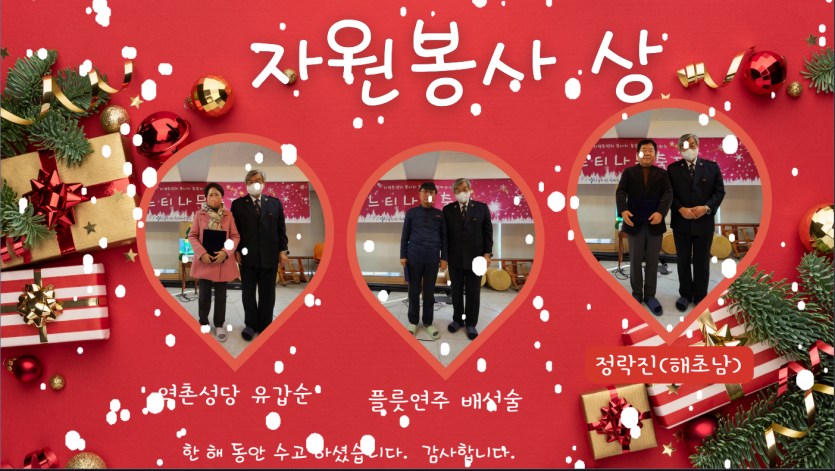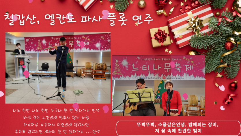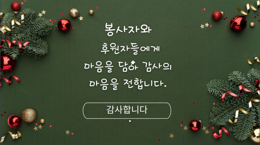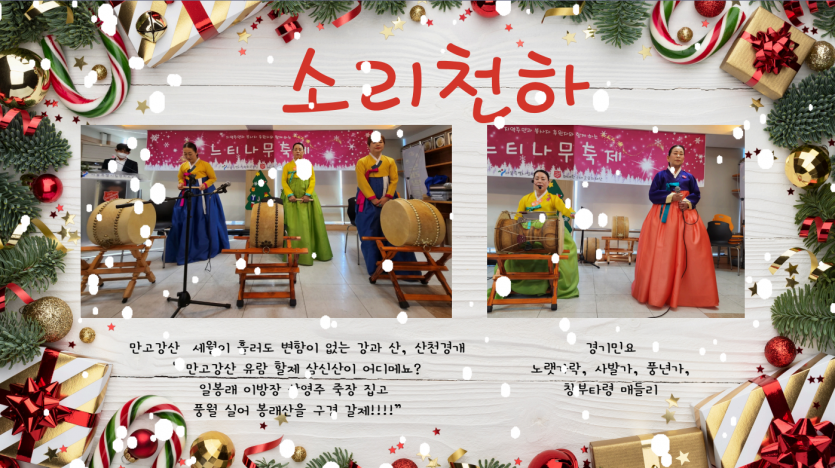 후원자·봉사자 이야기 | 1207 느티나무 축제 페이지 정보 작성자 장설궁 작성일 24-12-12 13:19 조회 6,573회 댓글 0건 본문 "2024년 12월 7일거주인, 자원봉사자, 후원자들과 함께 느티나무 축제를 진행하였습니다. 참석해주신 여러분들에게 감사의 마음을 전합니다. 여러분의 따뜻한 마음과 참여로 인해 행사는 더욱 특별하고 의미 있는 시간이 되었습니다. 여러분의 지지와 도움에 진심으로 감사드립니다. 다시 한 번 참석해주신 여러분들에게 진심으로 감사의 말씀을 전하며, 앞으로도 함께 더 많은 아름다운 순간을 만들어 나가기를 기대합니다. 감사합니다." 이전글 다음글 검색 목록