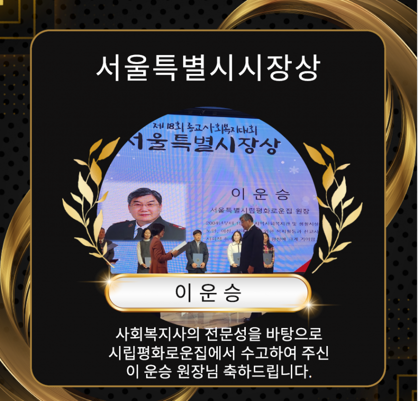 제18회 종교사회복지대회 서울특별시장상 페이지 정보 작성자 장설궁 작성일 24-01-10 11:51 조회 6,160회 댓글 0건 본문 지난 12월 27일 오후 4시 30분 서울 마포구 케이터틀에서 ‘제18회 종교사회복지대회’를 개최했습니다사회복지의 성장을 위해 헌신한 서울특별시립평화로운집 이운승 원장님께서 서울특별시시장상 수상하셨습니다. 축하드립니다. 이전글 다음글 목록