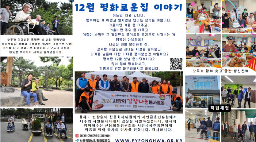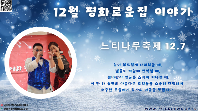 2024년 12월 후원감사편지 페이지 정보 작성자 장설궁 작성일 24-12-01 11:04 조회 5,733회 댓글 0건 본문 얼마전 첫눈이 내렸는데...그것도 엄청 많이..혹시 보셨나요?날씨도 갑자기 추워지고, 눈도 내리는 것이 본격적인 겨울이 왔나 봅니다.한 해가 가버린다고 아쉬워하기 보다는 아직 남아있는 시간들을 알차게 보내는 12월 되시길 바랍니다. 항상 건강하시고 행복하세요 이전글 다음글 목록