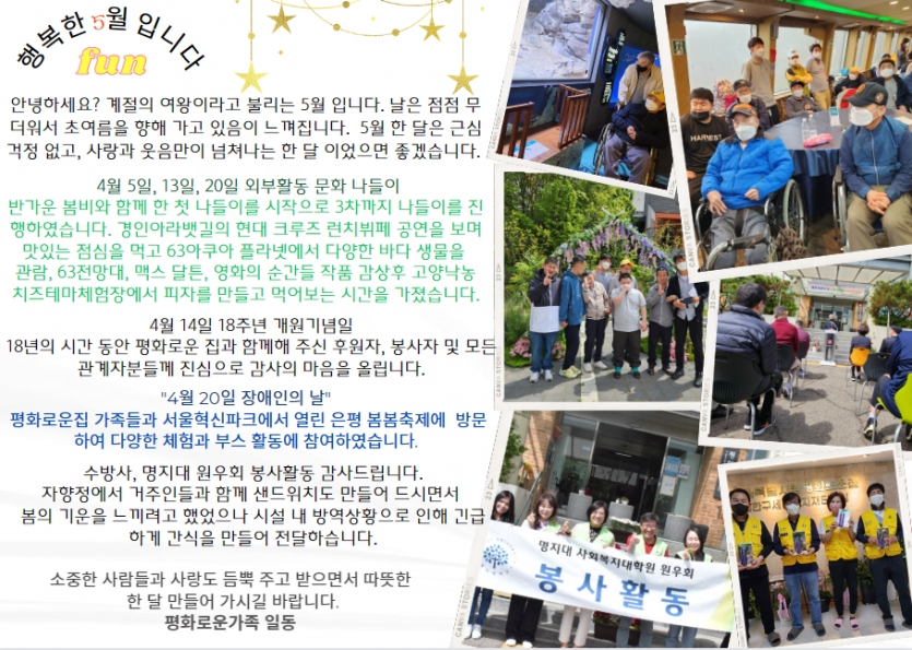 2023년 5월 후원감사편지 페이지 정보 작성자 장설궁 작성일 23-05-10 16:23 조회 9,999회 댓글 0건 본문 초록 세상 5월입니다.화사한 꽃과 함께 싱그러운 나뭇잎을 보며 마음의 평화와 기쁨을 느껴 보시길 바라며 평화로운 가족의 소식을 전해드립니다. 이전글 다음글 목록