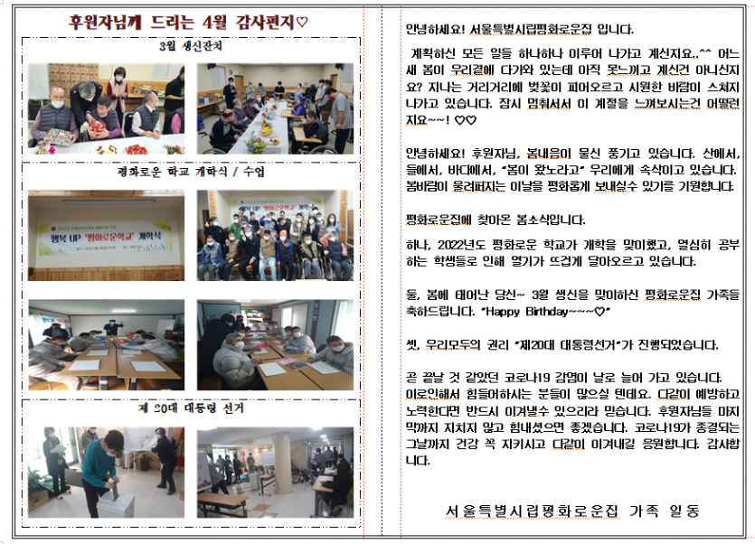 2022년 4월 후원자 감사편지 페이지 정보 작성자 장설궁 작성일 22-07-08 13:20 조회 12,013회 댓글 0건 본문 ♡ 봄향기가 느껴지는 4월 입니다. 행복의 향기가 가득하기를 기원하면서 저희 평화로운집 식구들의 이야기를 전해 드립니다~~♡ 이전글 다음글 목록