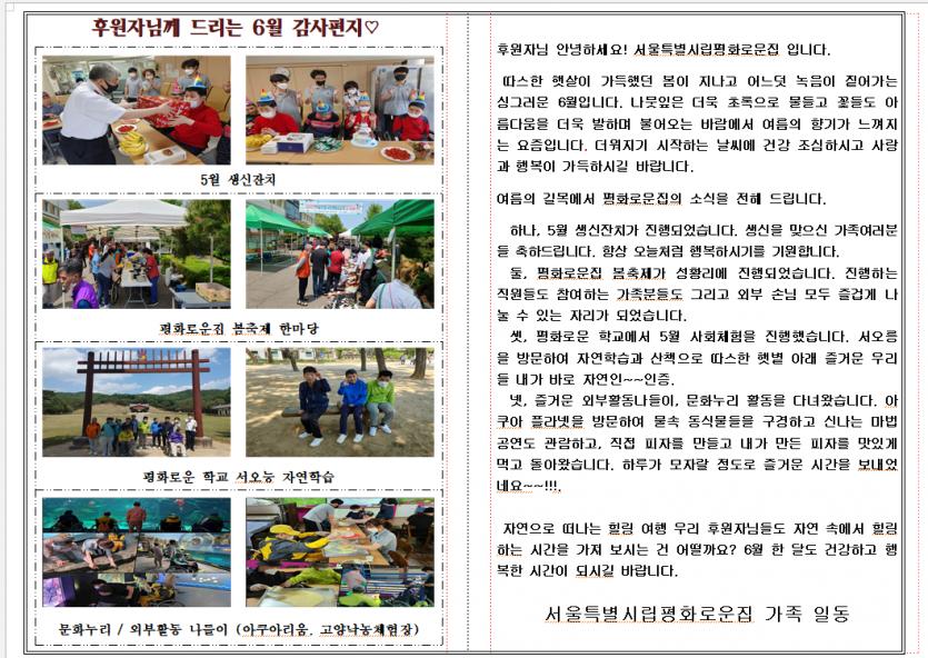 2022년6월 후원자 감사편지 페이지 정보 작성자 장설궁 작성일 22-07-13 18:03 조회 12,072회 댓글 0건 본문 "어느덧 한 해의 반인 6월이 다가왔습니다"특히, 6월은 호국보훈의 달이기도 하지요. 6월어느 하루 쯤은 오늘의 나라를 위해 희생한 많은 사람들을 위한 생각을 해보았으면 합니다. 덥고 습해지는 날씨에 건강에 유의하시고 항상 행복하시기 바라면서 평화로운집 가족들의 소식을 전해드립니다~~~ 충성 !! 이전글 다음글 목록