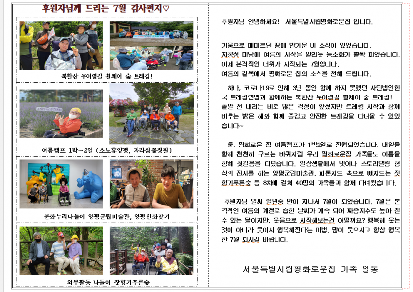 2022년 7월후원자감사편지 페이지 정보 작성자 장설궁 작성일 22-07-14 11:29 조회 12,261회 댓글 0건 본문 ༼ つ ◕_◕ ༽つ들쑥날쑥한 돌멩이가 있기 때문에 시냇물이 아름다운 소리를 내듯이 들쑥날쑥한 일상의 일들이 있을 때 인생도 아름다운 소리를 낸다고 합니다.(●'◡'●)인생이란 계속 좋은일만 있는것도, 계속 나쁜일만 있는 것도 아닙니다.혹시라도.... 지금 힘든일이 있다면.....시간이 조금 지나면 다~~~ 괜찮아 질겁니다.희망을 갖고 힘내세요~ 오늘도 화이팅!! 저희 평화로운집 가족들의 소식을 전해드립니다. 이전글 다음글 목록