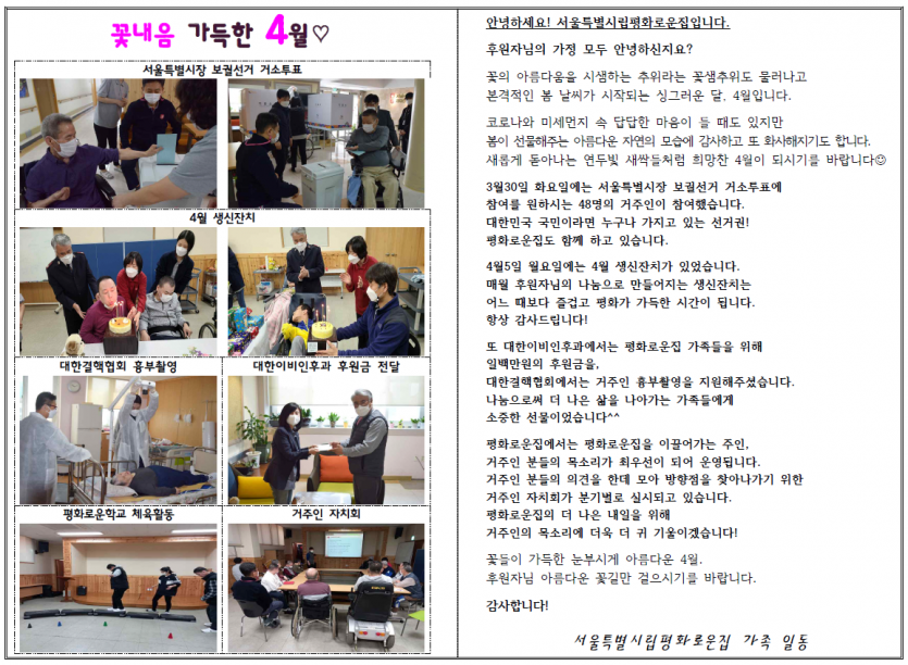 2021년 4월 후원자 감사편지 페이지 정보 작성자 박상은 작성일 21-04-07 09:40 조회 14,316회 댓글 0건 본문 2021년 4월, 활짝 핀 꽃들의 아름다움처럼 빛나는 후원자님의 나눔에 감사드립니다.늘 나눔으로 함께해주시는 후원자님께감사의 편지를 올립니다. 이전글 다음글 목록