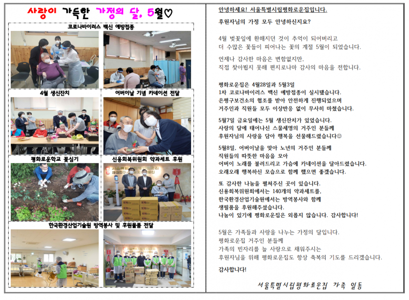 2021년 5월 후원자 감사편지 페이지 정보 작성자 박상은 작성일 21-05-17 17:55 조회 14,512회 댓글 0건 본문 5월은 꽃의 계절, 사랑의 계절..항상 사랑으로 함께 해주시는 후원자님의 나눔에 감사드립니다.늘 나눔으로 함께해주시는 후원자님께감사의 편지를 올립니다. 이전글 다음글 목록