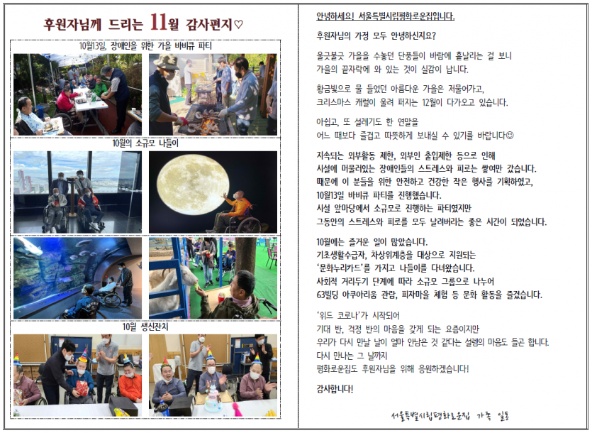 2021년 11월 후원자 감사편지 페이지 정보 작성자 박상은 작성일 21-11-18 10:04 조회 12,852회 댓글 0건 본문 첫눈이 내리는 가을입니다.11월, 후원자님께 감사의 편지를 올립니다. 이전글 다음글 목록