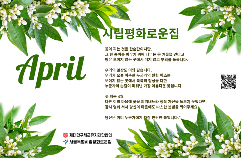 2026년 시립평화로운집 4월 후원감사편지 페이지 정보 작성자 장설궁 작성일 26-04-01 16:51 조회 28회 댓글 0건 본문 꽃보다 아름다운 마음을 나누어 주시는 후원자님께 감사드립니다. 후원자님의 나눔은 우리 거주인 분들에게 따뜻한 밥 한 끼가 되고, 깨끗한 보금자리가 되며, 내일을 살아갈 희망이 됩니다.보내주신 사랑에 보답하기 위해 오늘도 저희는 정성을 다해 거주인 분들을 모시겠습니다. 기분 좋은 봄바람처럼 늘 행복한 일들만 가득하세요! 다음글 목록