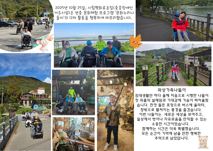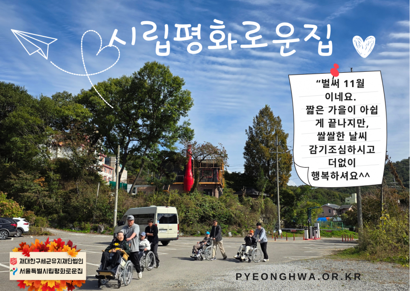 2025년 시립평화로운집 11월 후원감사편지 페이지 정보 작성자 장설궁 작성일 25-11-11 16:11 조회 1,441회 댓글 0건 본문 11월은좋은 일들은 1과 1사이에 +가 돼서2배가 되고나쁜 일들은 1과 1사이에 -가 돼서0이 됐으면 좋겠다.가을 하늘 아래선아무 이유 없이 기분이 좋아지지 않나요?커피 향 속에서마음도 조금 더 따뜻해졌으면 해요 이전글 다음글 목록